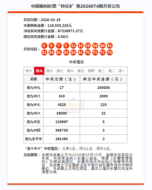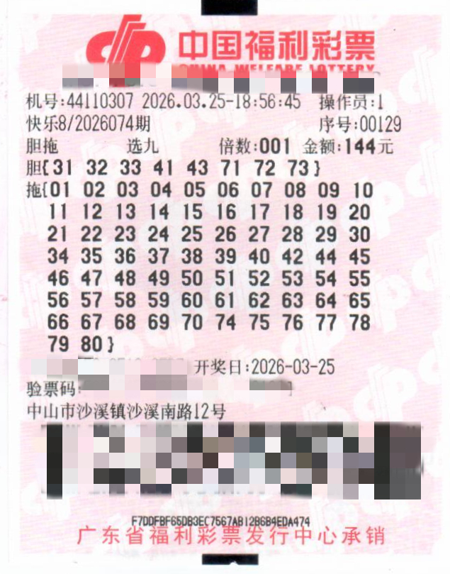 2026年3月25日晚,中国福利彩票“快乐8”游戏第2026074期开奖,当期全国共中出“选九中九”17注,单注奖金25万元,其中12注花落广东省中山市沙溪镇沙溪南路12号的44110307福彩销售站点。