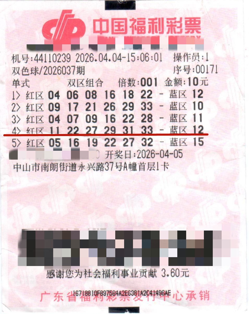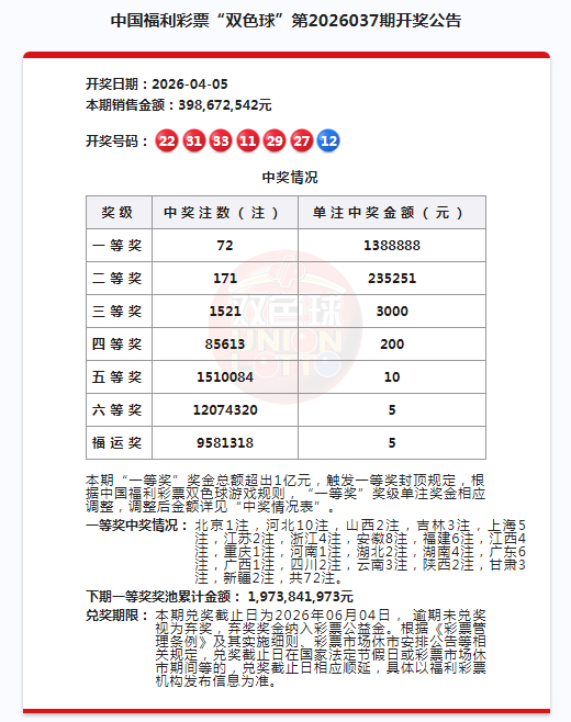 2026年4月5日晚,中国福利彩票“双色球”第2026037期开奖,当期全国井喷72注一等奖,其中2注花落中山市,分别为南朗街道永兴路37号A幢首层1卡的44110239号福彩销售站点以及西区街道沙朗金港路117号44110571号福彩销售站点。经统计,中山彩民2026年已中出3个双色球一等奖!